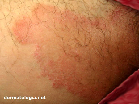 As lesões podem ser únicas ou múltiplas e confluirem, formando grandes placas avermelhadas e descamativas, que se extendem progressivamente. Pode haver a presença de pústulas (pequeninas bolhas de pus).